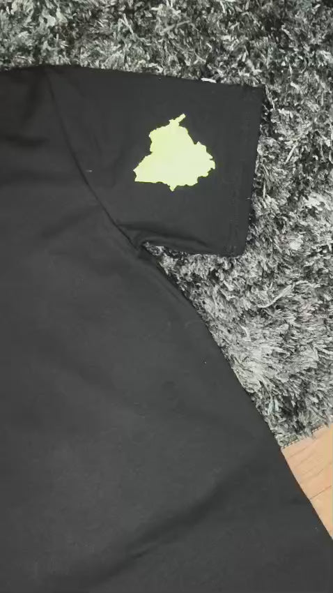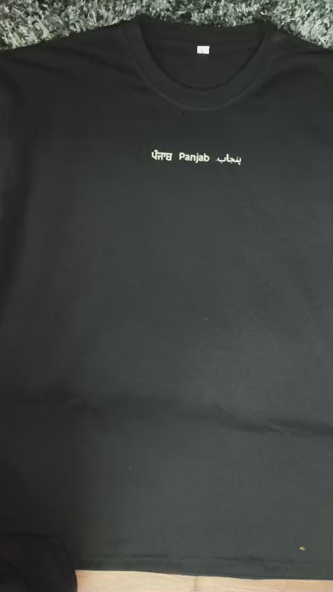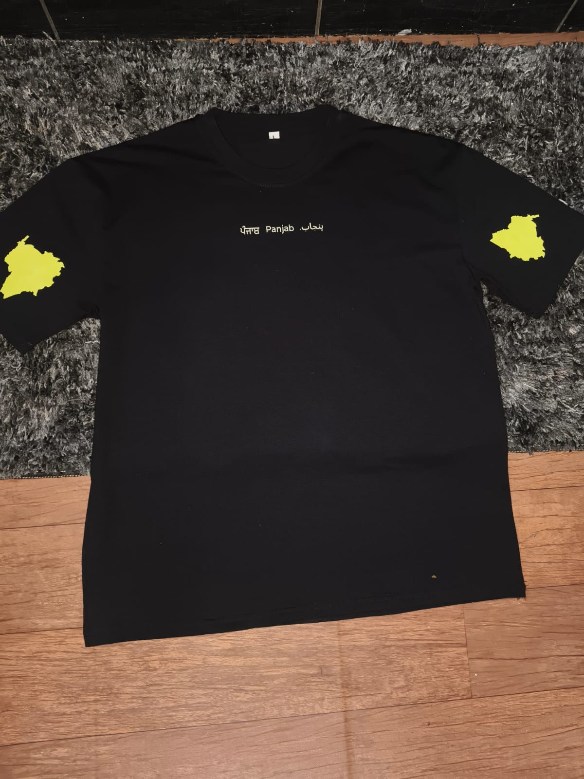 This black oversized t-shirt celebrates Panjab — written in Gurmukhi, English, and Urdu, uniting roots beyond borders. The fluorescent Panjab map on each sleeve represents strength, resilience, and pride.